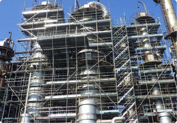 大小の差はありますが、外壁など普段は作業ができない箇所に足場を設置するために用途に応じて鋼や鉄製の足場を設置します。さらに、物の落下・飛び出しや塗料の飛散防止などのためにメッシュシートで外側を覆います。